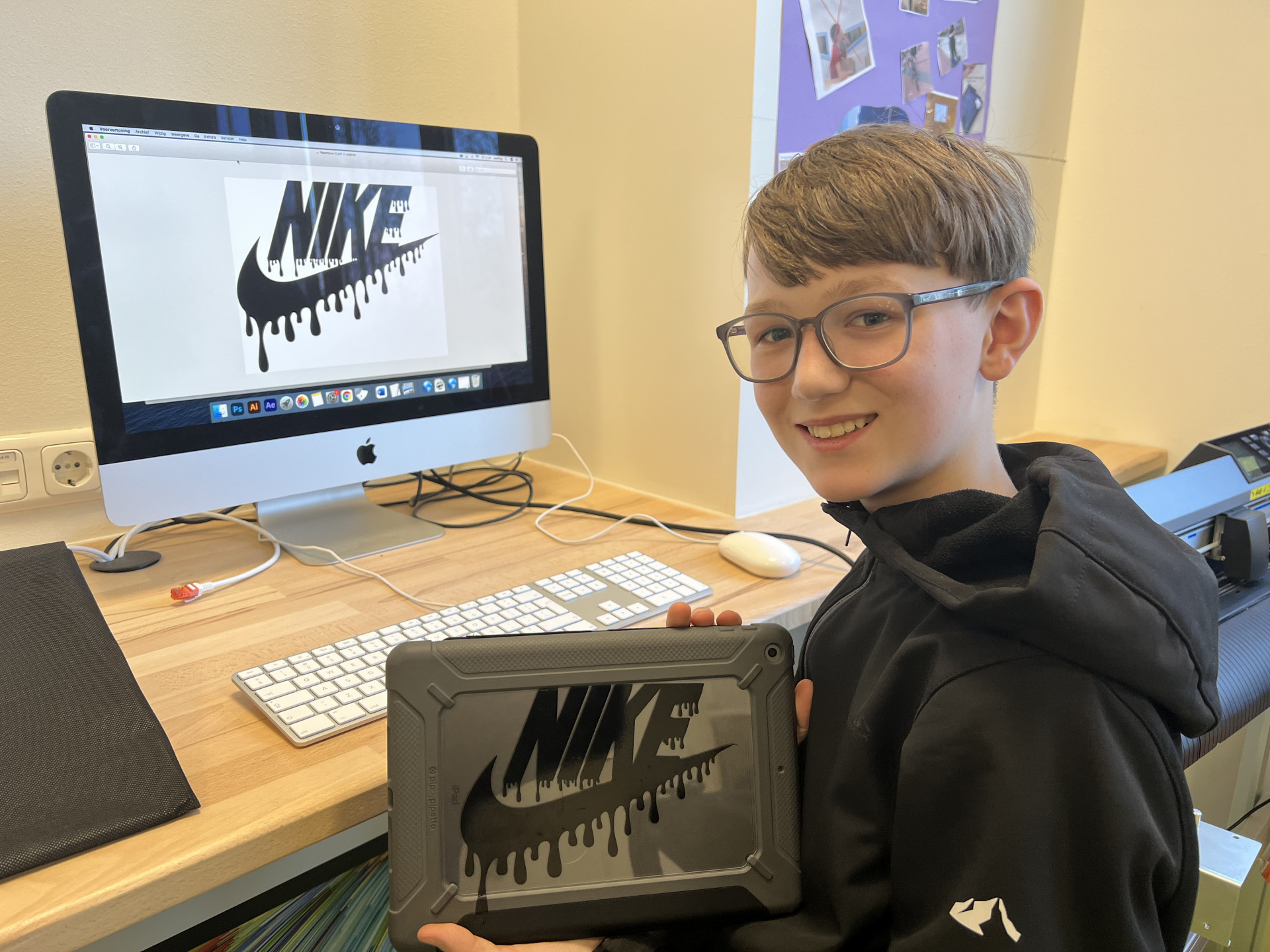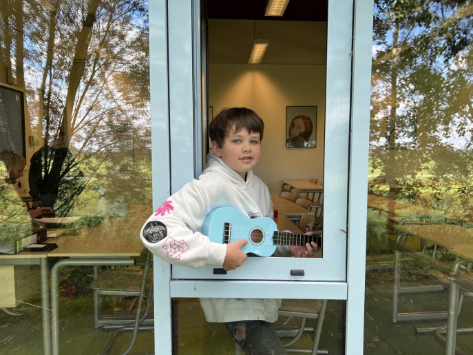 Roan: Ik hang op elke basisschool omdat ik op de poster voor het Open Huis sta. Ik vond het superleuk om te doen en krijg ook veel leuke reacties. Wat ik fijn vind aan deze school? Nou, alles is digitaal dus ik heb geen zware rugzak. En de docenten zijn heel aardig. In de stamgroep leer je zelf inplannen en daarna heb je leeractiviteiten zoals bijvoorbeeld nask, dan ga je proefjes doen enzo. Je kan een workshop kiezen waar je mag samenwerken. Dat kan in de talenzone of themazone maar je kan ook kiezen voor het Van Kinsbergenplein, daar kan je stil aan het werk met je werkdoelen.